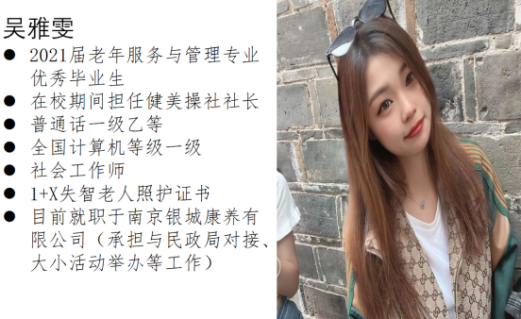吴雅雯同学现就职于南京银城康养有限公司,从事老年游戏策划和行政工作。她分享了在欧葆庭实习期间的心路历程。毕业后她到校企合作单位银城康养就职,承担与民政局对接、大小活动举办等工作。她用自己的经历告诉学弟学妹们,养老行业是朝阳产业,需要新生力量,只要肯钻研、肯吃苦,就大有作为。