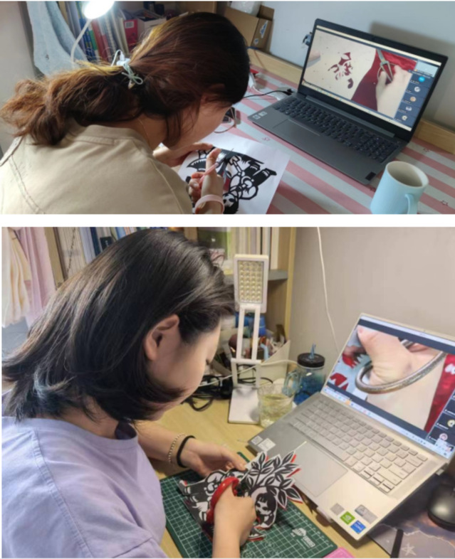 张钧老师通过视频连线传播剪纸文化,教授剪纸技巧,学生在教育基地体验剪纸,剪纸主题讴歌抗疫精神,颂扬百年党史,弘扬青春之歌。除现场体验外,云端的近两百名同学在宿舍里亲身体验了剪纸的过程。活动结束后,同学们上传了活动图片,纷纷表示,剪纸看着简单,但它需要手和脑的高度配合,特别考验一个人的观察力和注意力。不但如此,它还能起到调整呼吸、放松身心的作用,对于疫情期间的同学们而言,既有趣味,又有益处。方寸之间,还寄托了大学生们对美的追求和对未来的向往。