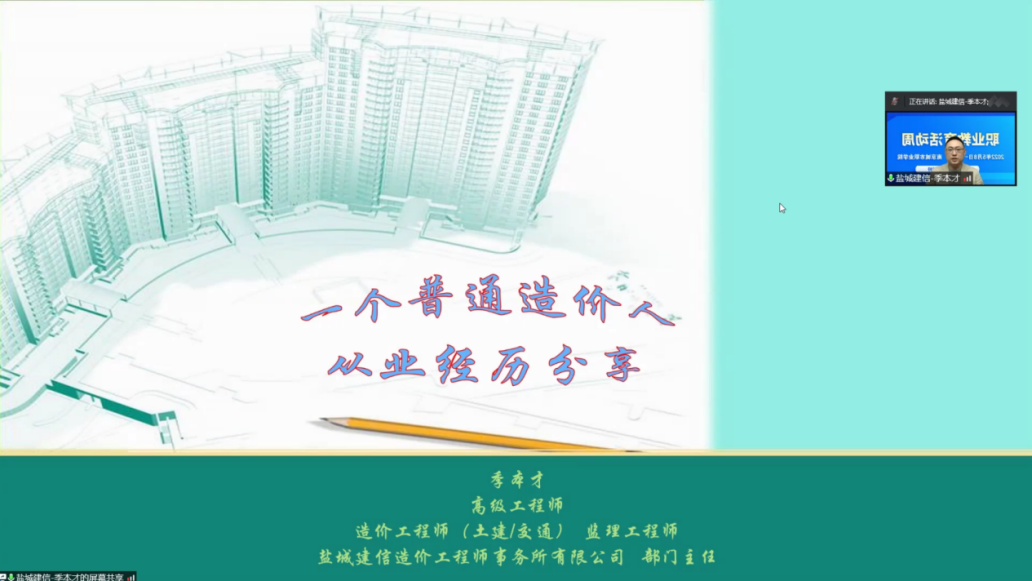 为弘扬工匠精神,引导学生提升职业技能,走技能成才、技能报国之路,值此2022年职业教育活动周之际,我校王剑BIM技能大师工作室于2022年5月12日邀请了江苏省技术能手、江苏省五一创新能手季本才先生做了一场“一个普通造价人”的从业经验在线分享会。分享会由杨国平老师主持,康养工程学院工程造价、建筑工程技术专业约200名学生参加。