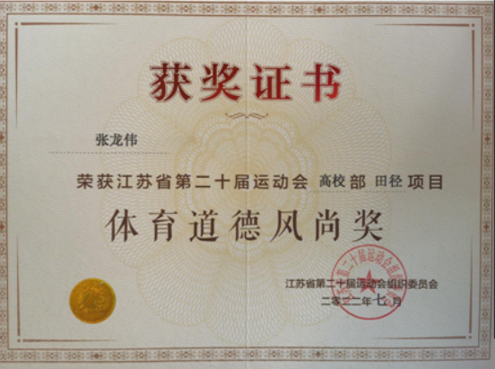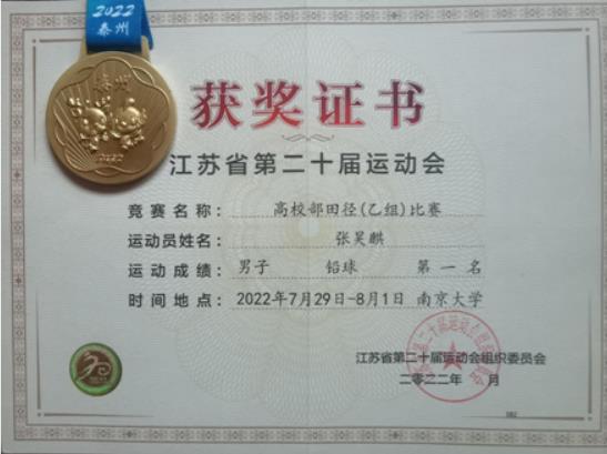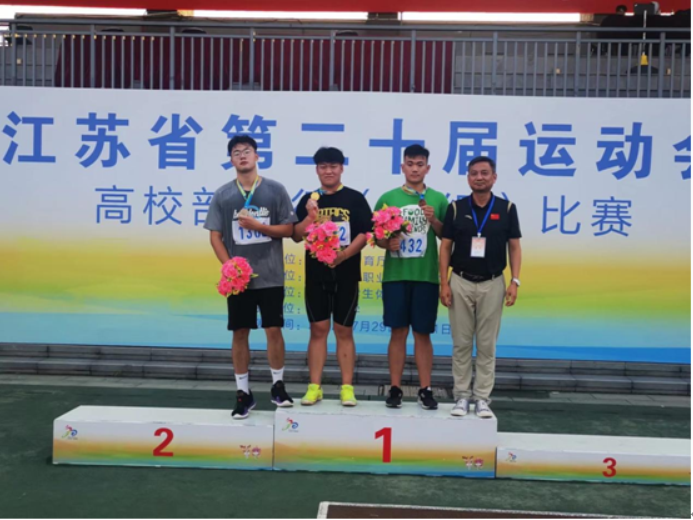近日,江苏省第二十届运动会高校部田径(乙组)比赛在南京大学仙林校区举行。省运会四年一次,由省教育厅与省体育局共同主办,共有全省38所高职院校459名运动员参赛。我校由张之海、孙宇、赵壮壮带队,张昊麒、张龙伟、孙伟豪三名同学参赛。智能工程学院张昊麒获得男子铅球项目冠军,康养工程学院张龙伟获得体育道德风尚奖。这是我校体育健儿获得的首枚省运会金牌,突破零的纪录,创造了我校体育赛事最好成绩。