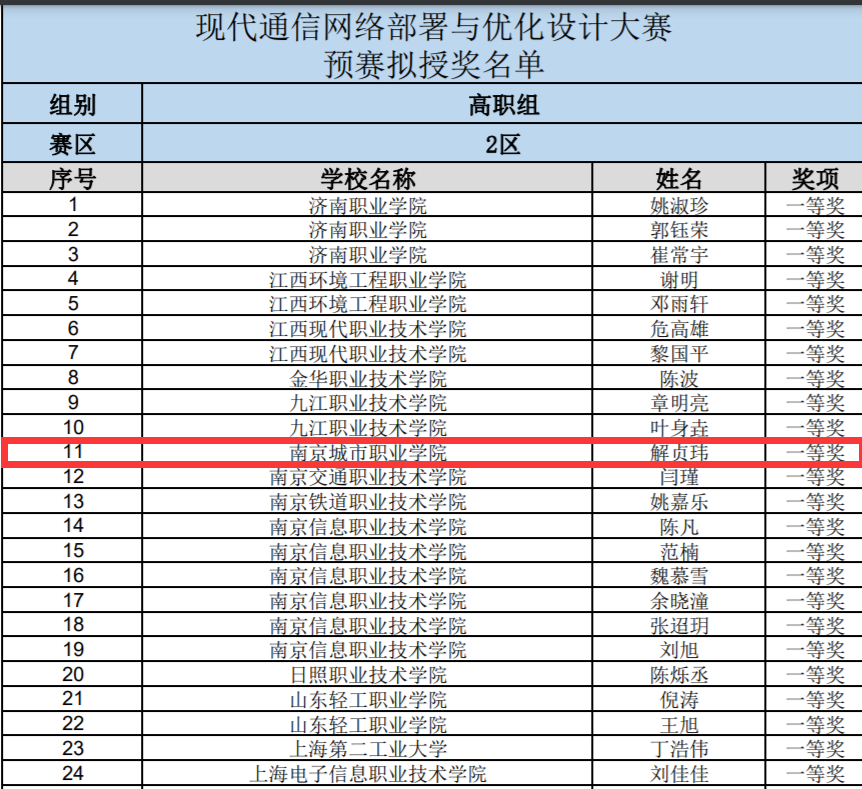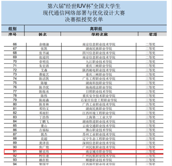 2022918925日,智能工程学院2020级移动通信技术专业解贞玮、桂欣羽2021级计算机网络技术专业武云、万梦雪同学代表我校参加了由中国通信学会主办,南京邮电大学承办的2022年第六届“经世IUV杯”全国大学生现代通讯网络部署与优化设计大赛。此项赛事共有三百余所院校的五千余名选手参赛经过线上预赛和决赛的激烈角逐,我院解贞玮同学获得预赛一等奖,桂欣羽武云同学获得预赛二等奖,万梦雪同学获得预赛三等奖的好成绩。综合统计获奖结果为:高职组共有155名选手获奖,我院解贞玮同学进入决赛并获得高职组决赛三等奖的较好成绩。