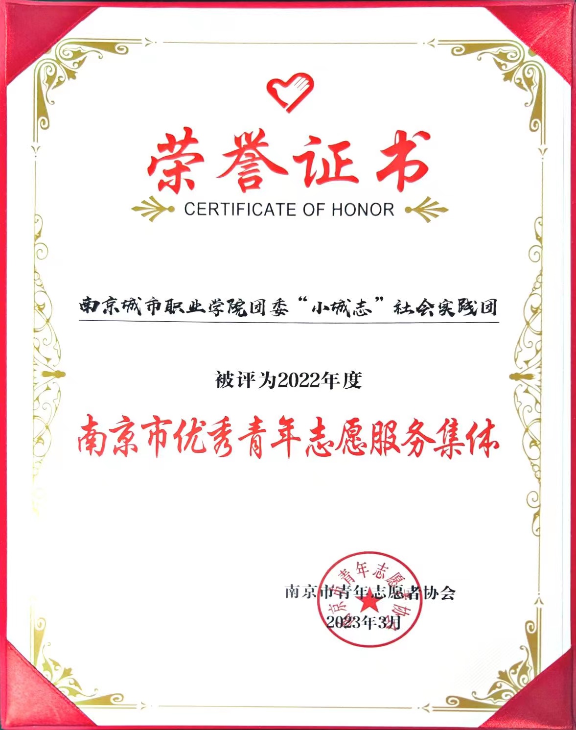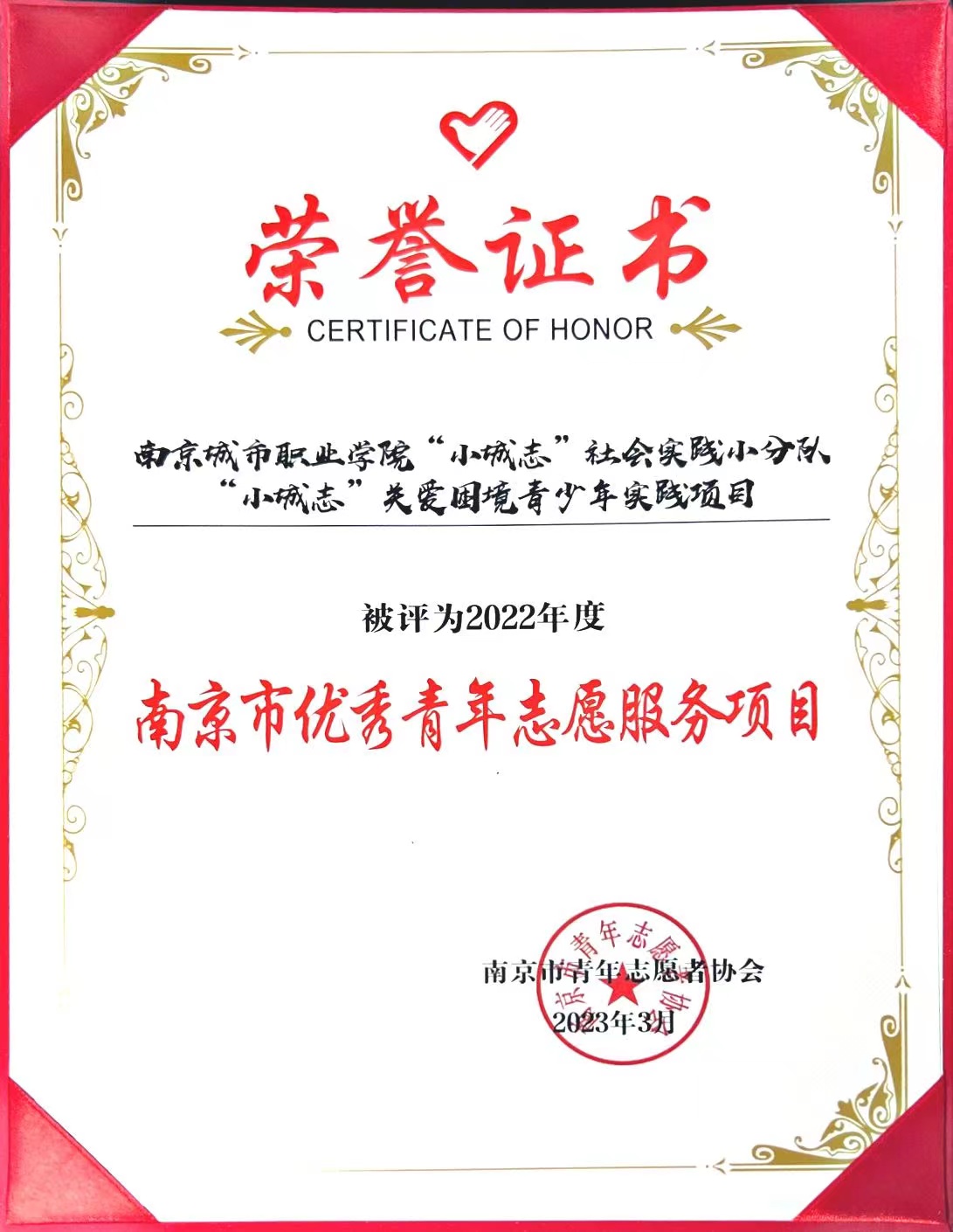 近日,2022年度南京市青年志愿服务典型寻访活动结果公布。我校团委“小城志”社会实践团被评为2022年度南京市优秀青年志愿服务集体,“小城志”社会实践小分队“小城志”关爱困境青少年实践项目被评为2022年度南京市优秀青年志愿服务项目,蔡静同志被评为2022年度南京市优秀青年志愿者。