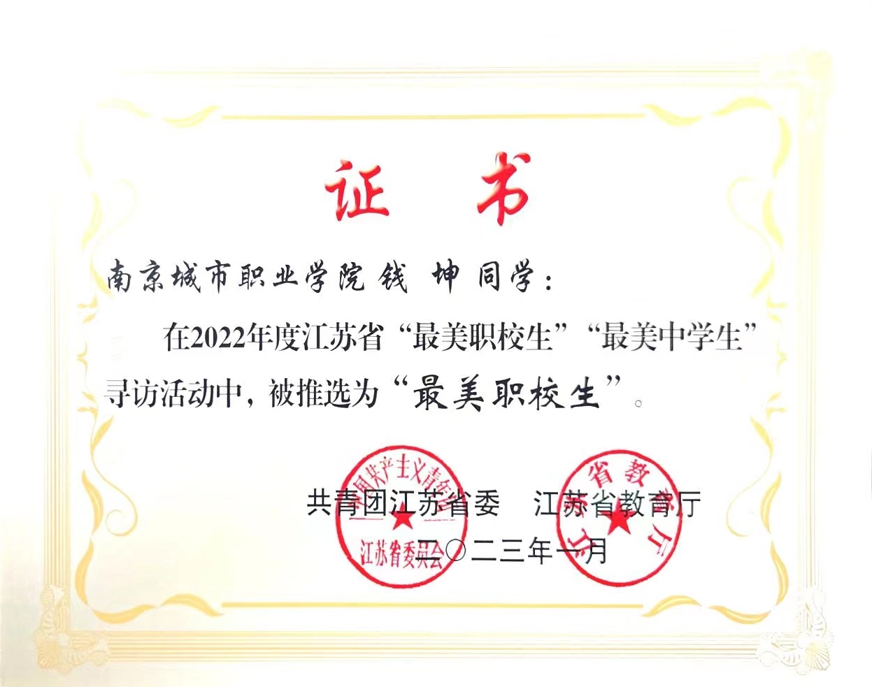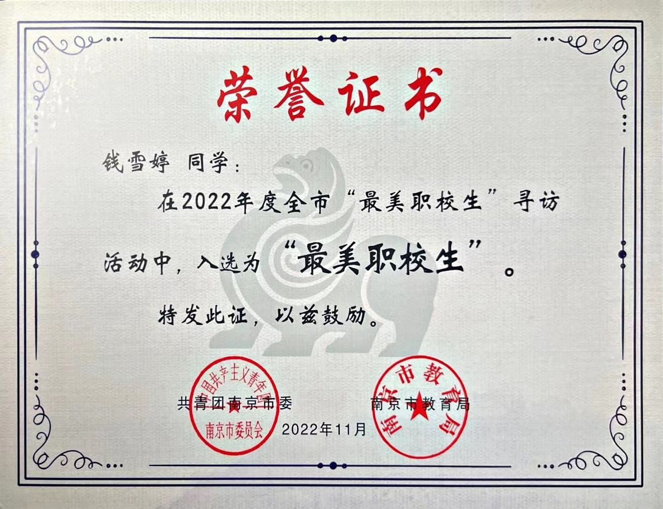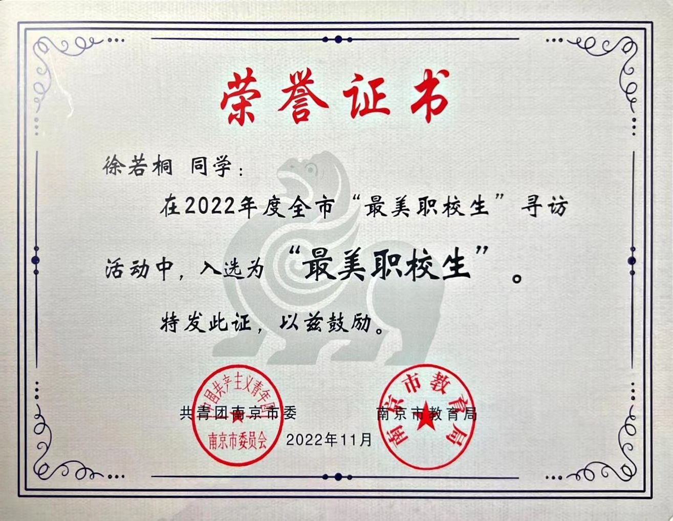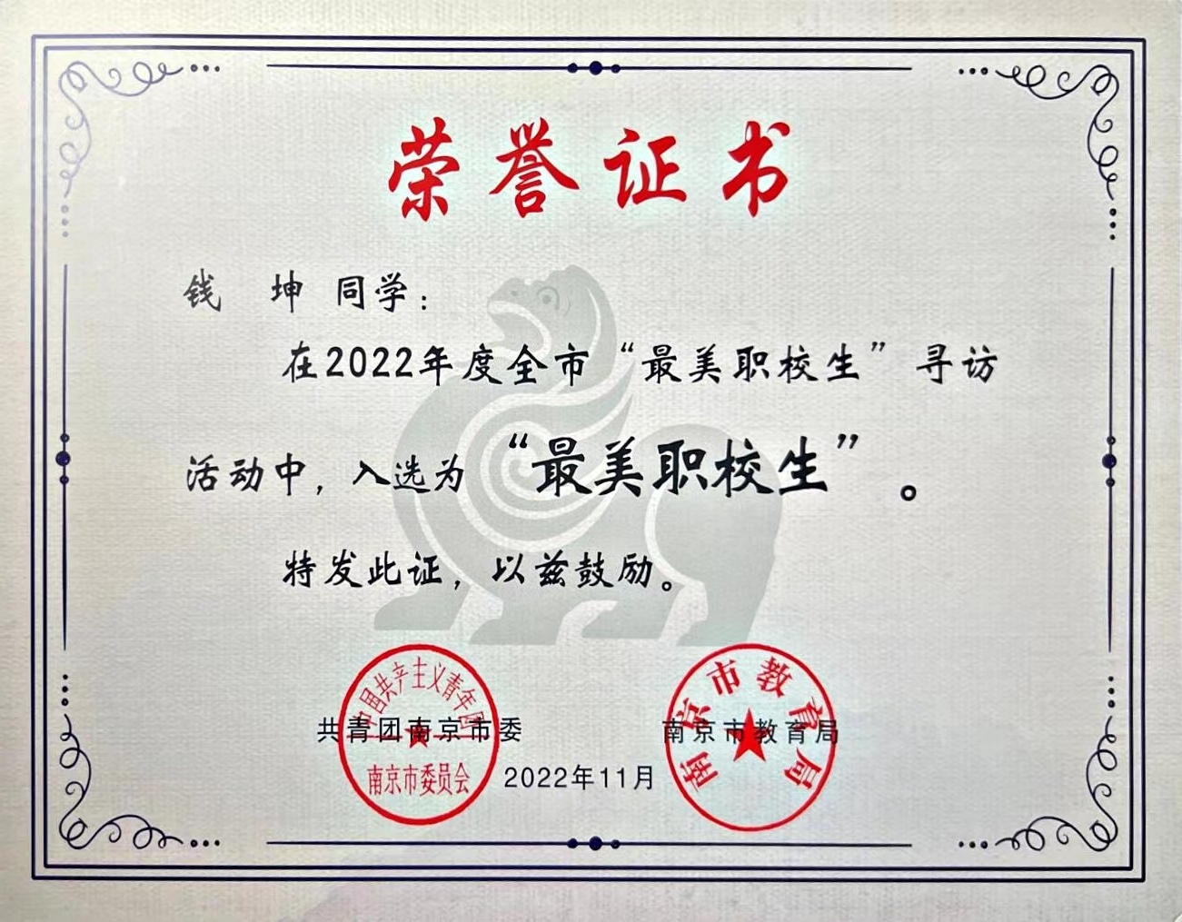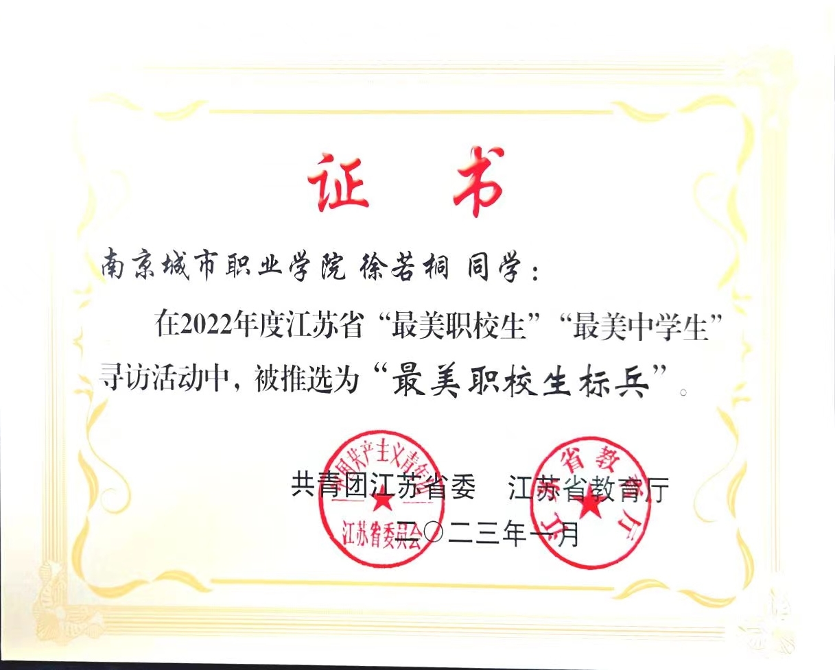 近日,由共青团江苏省委、江苏省教育厅联合开展的2022年度江苏省“最美职校生”寻访活动,由共青团南京市委、南京市教育局联合开展的2022年度南京市“最美职校生”寻访活动结果正式揭晓。我校康养工程学院徐若桐同学荣获江苏省“最美职校生标兵”、南京市“最美职校生”;智能工程学院钱坤同学荣获江苏省“最美职校生”、南京市“最美职校生”;数字财商学院李雪瑶、钱雪婷、梁馨月同学,数字文创学院田智颖同学和智能工程学院王海鹏同学荣获南京市“最美职校生”。