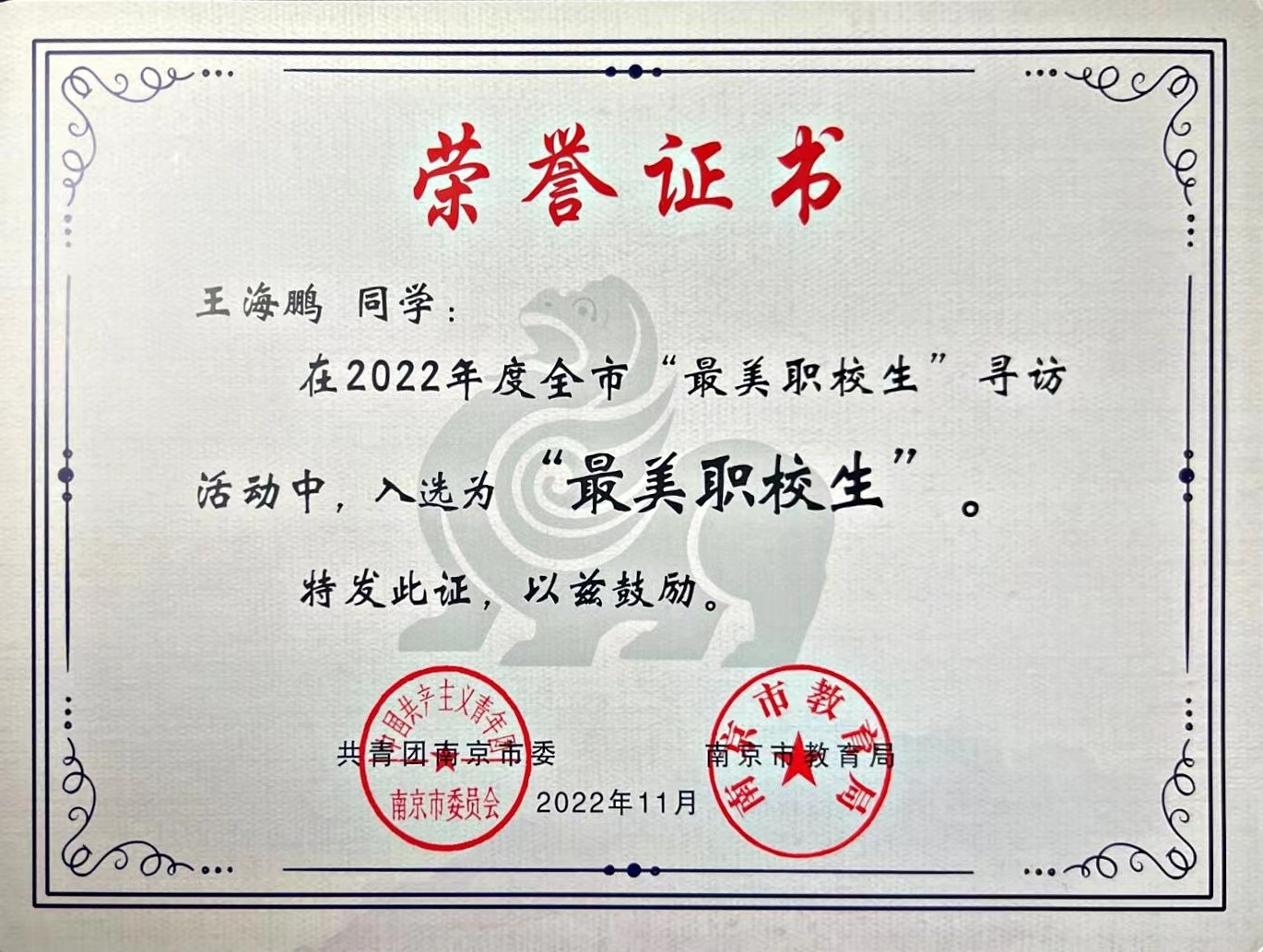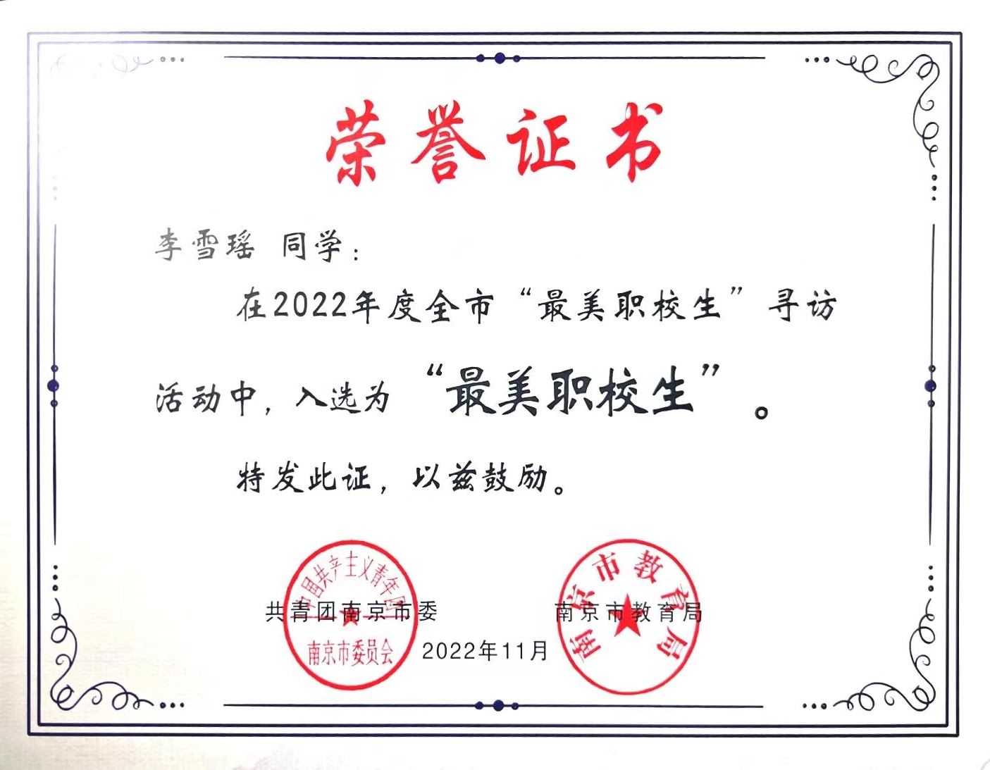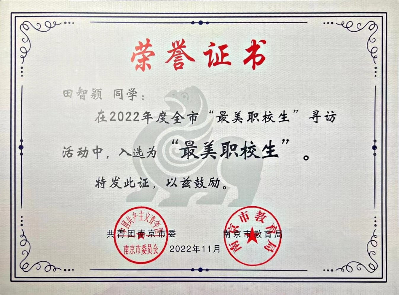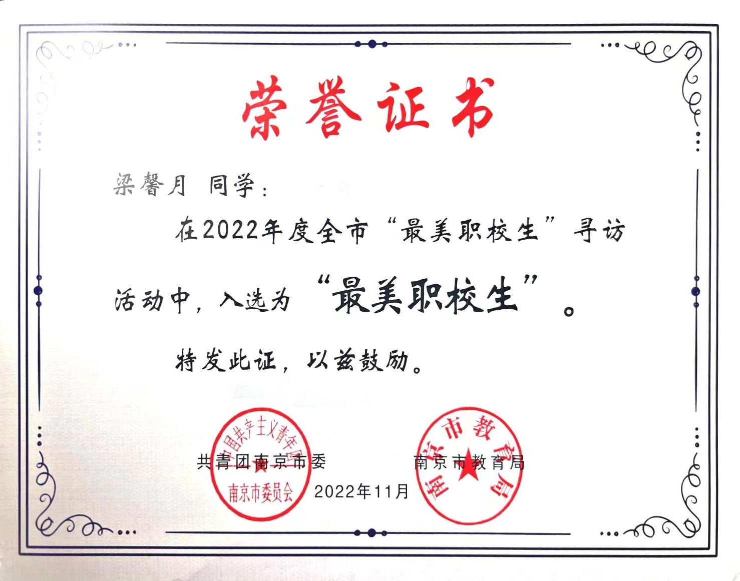 近日,由共青团江苏省委、江苏省教育厅联合开展的2022年度江苏省“最美职校生”寻访活动,由共青团南京市委、南京市教育局联合开展的2022年度南京市“最美职校生”寻访活动结果正式揭晓。我校康养工程学院徐若桐同学荣获江苏省“最美职校生标兵”、南京市“最美职校生”;智能工程学院钱坤同学荣获江苏省“最美职校生”、南京市“最美职校生”;数字财商学院李雪瑶、钱雪婷、梁馨月同学,数字文创学院田智颖同学和智能工程学院王海鹏同学荣获南京市“最美职校生”。