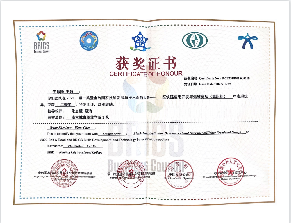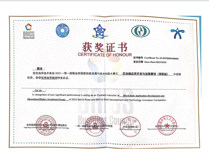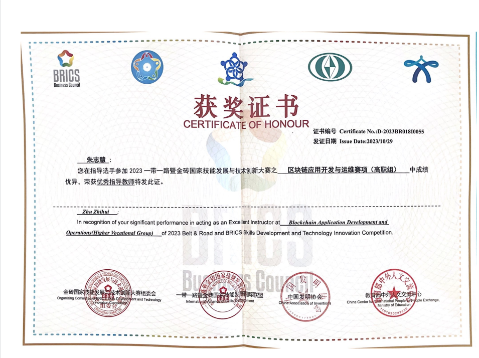 喜报:我校在2023一带一路暨金砖国家技能发展与技术创新大赛区块链赛项中荣获一等奖