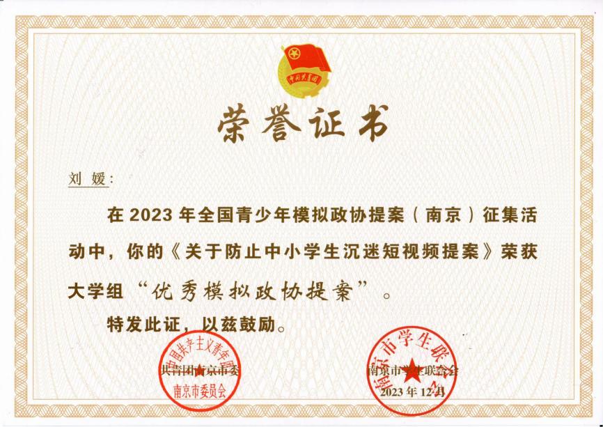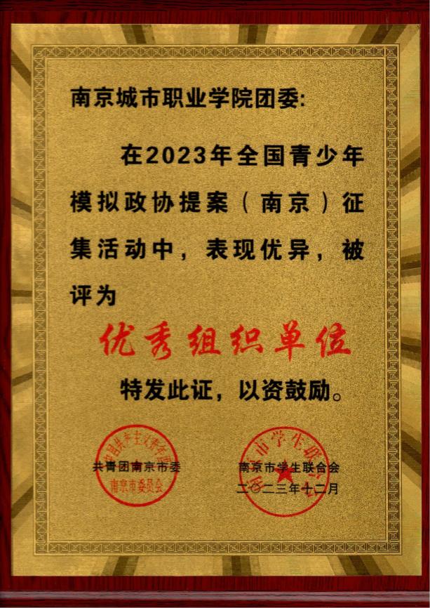 为深入学习宣传贯彻党的二十大精神,结合学习贯彻习近平新时代中国特色社会主义思想主题教育,2023年下半年,共青团南京市委、南京市学联联合开展了2023年南京市青少年模拟政协提案征集活动。近日,活动结果公布,我校团委荣获“优秀组织单位”荣誉称号,智能工程学院刘媛同学荣获大学组“优秀模拟政协提案”奖项。