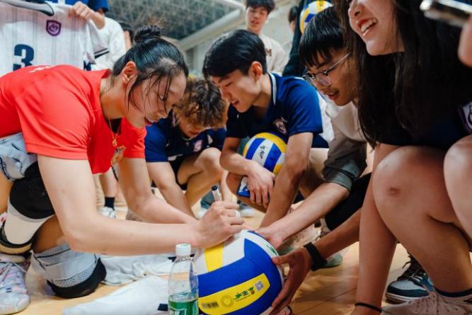 赛后,排球社的同学们与江苏女排队员进行了近距离地交流。女排队员们现场指导排球社同学们的气排球技巧,分享了自己的经验和心得。排球社社长王博同学激动地表示,这次活动不仅让他们亲身感受到了江苏女排队员的风采,更加深刻地理解了女排精神和团队合作的重要性。