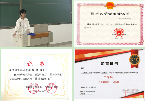 钱坤,男,汉族,中共预备党员,2020级软件技术专业学生,评定年度综合测评成绩专业排名第一,各科平均成绩达93分以上,曾任校人工智能社团副社长、2020级软件技术2班班长。所在团支部曾获校活力团支部、校文明班级、南京市五四红旗团支部等奖项和荣誉。个人曾荣获国家奖学金、国家励志奖学金、江苏省“最美职校生”、南京市“最美职校生”、校“三好学生标兵”、校“优秀学生干部”、校“优秀服务个人”、校“军训优秀学员”、校“优秀学生社团骨干”、校“创新创业标兵”、校“技术技能标兵”、全国软件嵌入式测试国赛二等奖、全国软件开发者测试国赛二等奖、全国软件移动应用测试国赛二等奖、全国软件嵌入式测试省赛一等奖、全国软件开发者测试省赛一等奖、全国软件移动应用测试省赛二等奖、蓝桥杯省赛二等奖、省技能软件测试赛项三等奖、学校综合奖学金一等奖、校社会服务奖学金、校技术技能奖学金、校创新创业奖学金等奖项和荣誉。