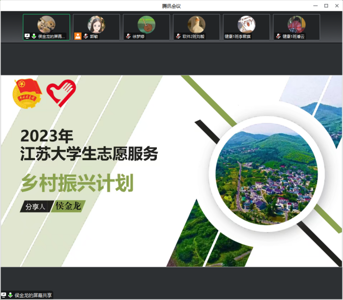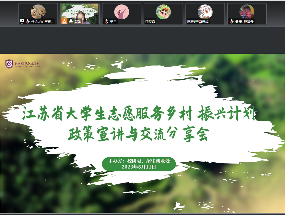 为更好地推进“大学生志愿服务乡村振兴计划”志愿者招募工作,引导和鼓励我校学子为江苏发展贡献青春力量,5月11日晚,校团委通过腾讯会议平台举办了江苏省大学生志愿服务乡村振兴计划政策宣讲和交流分享会。此次分享会邀请了志愿服务乡村振兴计划南京市项目办志愿者侯金龙和我校2018年苏北计划志愿者吴冉为同学们进行了宣讲与交流分享。此次分享会由校团委郭敏老师主持。此次活动吸引了全校100余名同学参与。