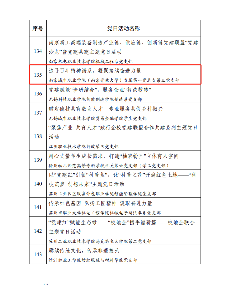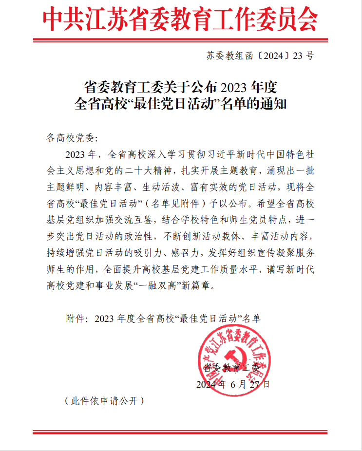 近日,省委教育工委公布了2023年度江苏省高校“最佳党日活动”名单。我校直属第一党总支第三党支部(现直属第一党总支思政部支部)的“追寻百年精神谱系,凝聚接续奋进力量”主题党日活动获评2023年度江苏省高校“最佳党日活动”。