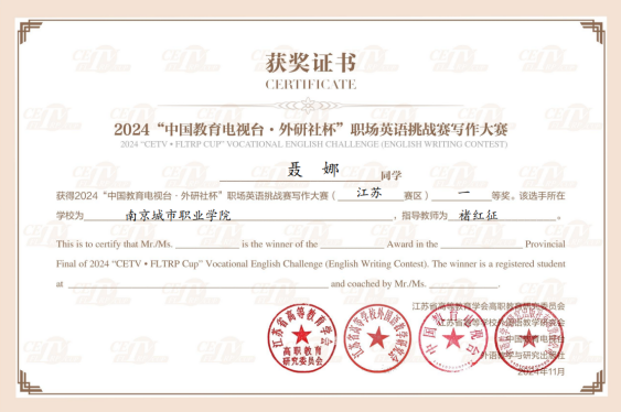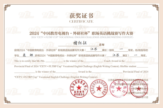 日前,2024“中国教育电视台·外研社杯”职场英语挑战赛江苏赛区写作比赛成绩公布。我校公共教学部褚红征老师指导的智能工程学院23级计算机应用技术专业聂娜喜获一等奖,数字财商学院23级大数据与会计专业袁铭悦和24级跨境电子商务专业王飞燕分获二、三等奖。