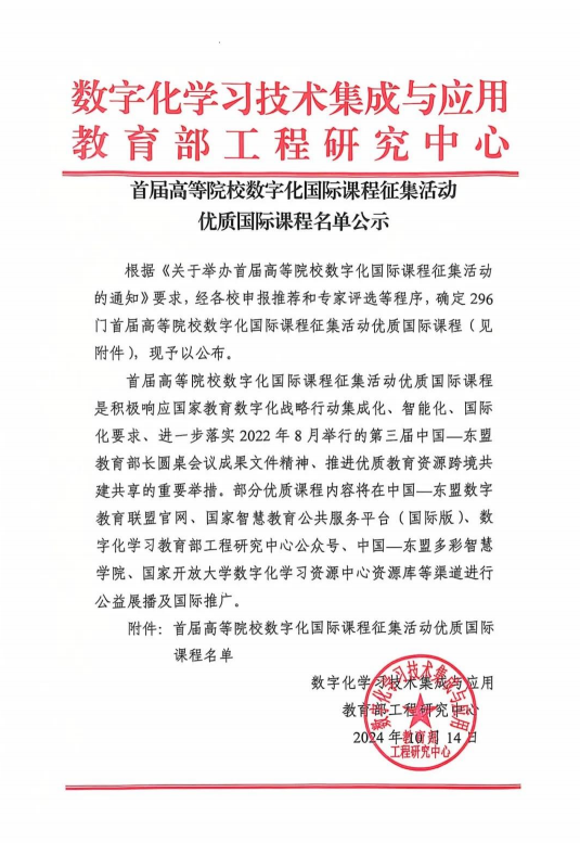 本次入选课程充分展现了学校数字化教学资源和数字化国际课程方面的广泛探索和创新实践。我校将以此次活动为契机,进一步深化数字化资源的建设,促进优质教育资源的共享,为培养更多具备国际视野和创新能力的高素质人才作出积极贡献。