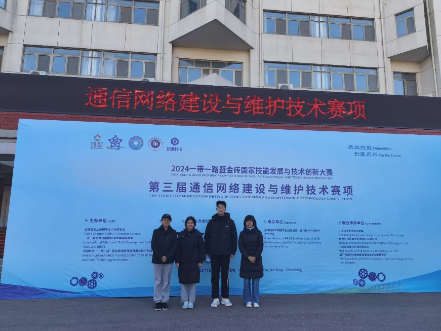 2024127128日,2024年“一带一路”暨金砖国家技能发展与技术创新大赛第三届通信网络建设与维护技术赛项(高职组)国内总决赛在山东信息职业技术学院举办,经过激烈角逐,我校智能工程学院代表队在97支决赛队伍中脱颖而出,23级计算机网络技术2班学生张涛、蒋玉洁荣获二等奖,指导教师杨洋、沈娟娟荣获优秀指导老师奖,学校荣获优秀组织奖。
