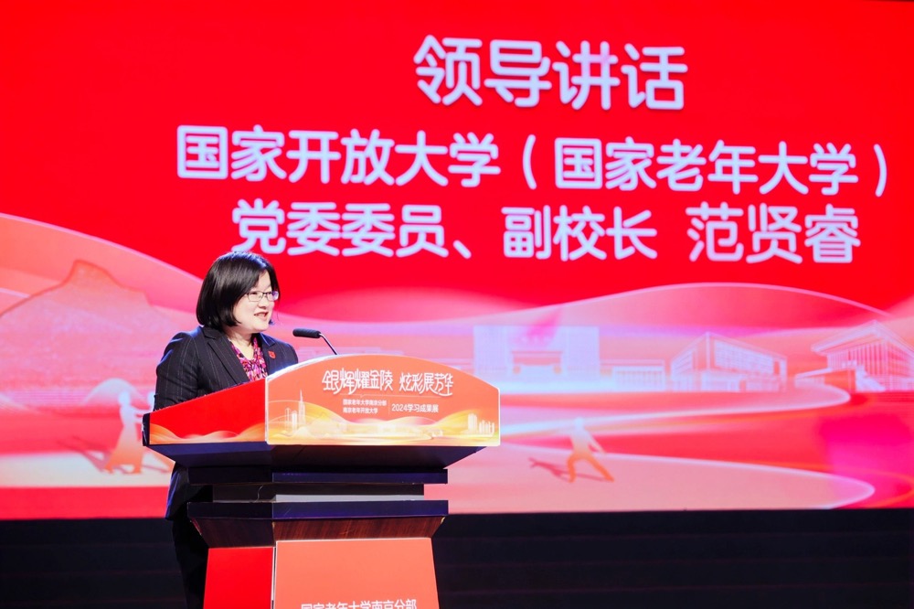 国家开放大学(国家老年大学)副校长范贤睿在讲话中介绍了国家老年大学正式挂牌成立以来,以“德学康乐为”为办学宗旨扎实推进的各项工作成果,充分肯定了南京开放大学在社区教育、老年教育方面所取得的成绩。她指出,国家老年大学南京分部揭牌,必将开启南京老年教育的崭新篇章。国家老年大学总部将进一步加大力度支持分部建设,与分部共享共建课程资源,互联互通学习平台,共培共育教师队伍,共推共办示范试点,共商共做科学研究,为积极践行“老有所学、老有所为、老有所乐”贡献力量,为建设终身教育体系、服务教育强国建设作出应有贡献。