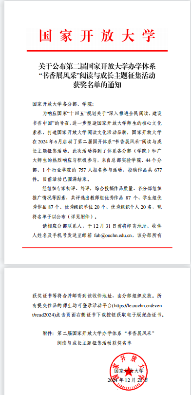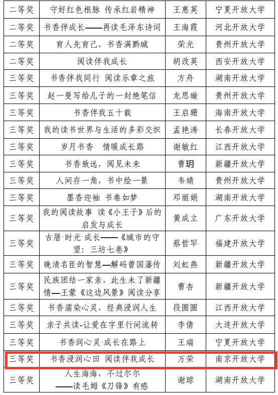 近日,国家开放大学正式公布了第二届国家开放大学办学体系“书香展风采”阅读与成长主题征集活动的获奖名单。我校浦口学习中心的万荣老师作品《书香浸润心田 阅读伴我成长》在此次活动中荣获三等奖,为我校赢得了荣誉。