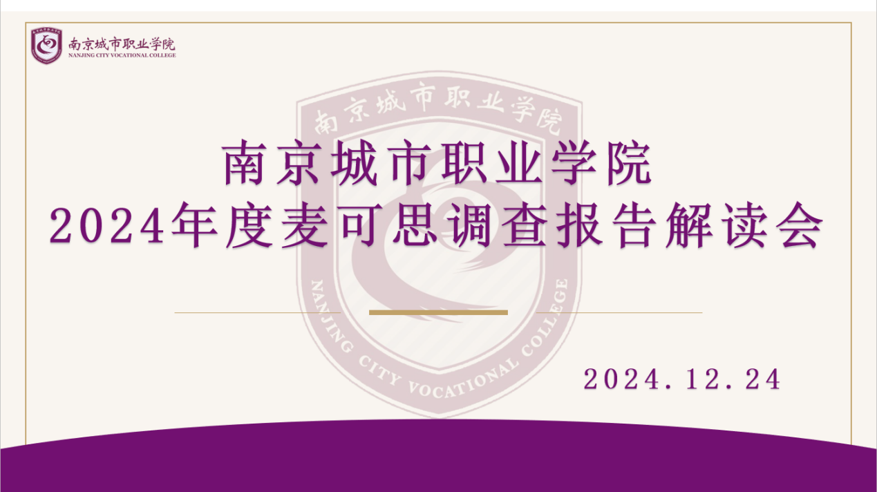 1224日下午,我校在溧水校区行政楼一楼报告厅召开2024年在校生与毕业生培养质量评价报告解读会。此次会议旨在深入分析我校学生培养成效及毕业生就业态势,推动教育教学改革,优化人才培育质量,助力办学水平提高。全体校领导出席会议,专任教师,有关院部、部门负责人、辅导员及相关工作人员共同参会。会议由校党委委员、副校长江景主持。