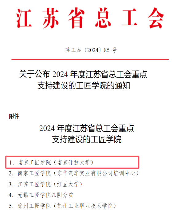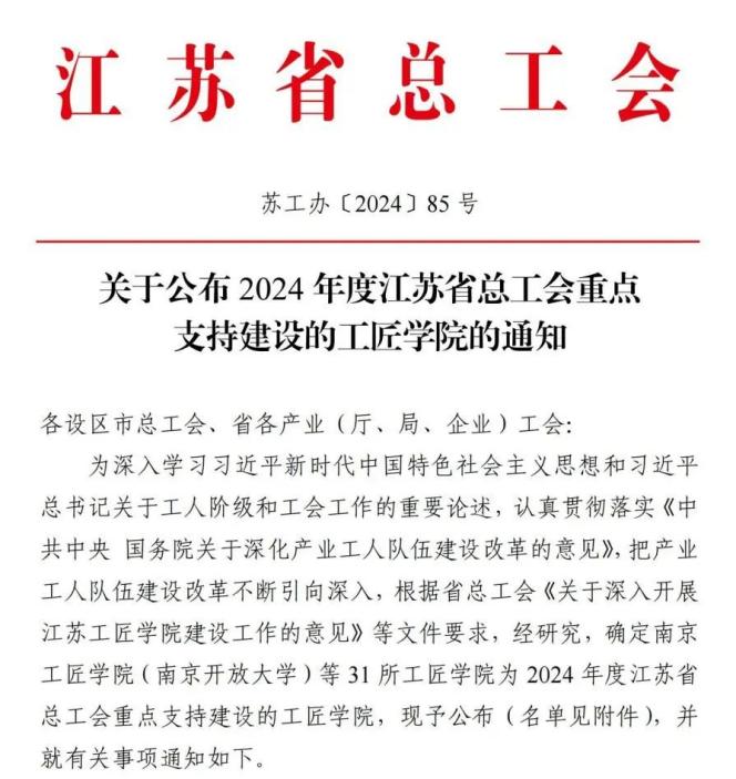 日前,江苏省总工会发布了《关于公布2024年度江苏省总工会重点支持建设的工匠学院的通知》,全省31家工匠学院成为江苏省总工会重点支持建设单位,我校工匠学院成功入选。