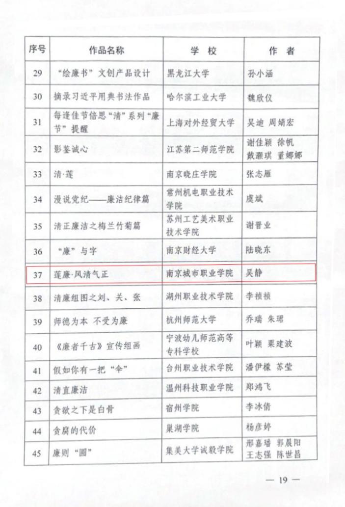 近日,教育部办公厅公布了第九届高校廉洁教育系列活动创意征集遴选结果。我校组织选送的数字文创学院产品艺术设计专业吴静同学作品《莲廉·风清气正》入选“画廉正心”创意征集遴选名单。据悉,我省共 30 件作品入选,优秀作品将在央视网、中国大学生在线、中国教育发布等平台展播。