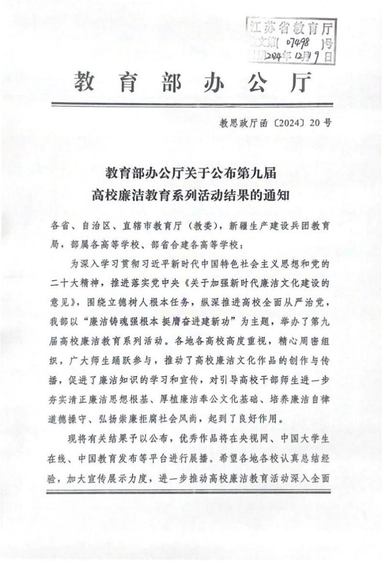 2024年5月,教育部举办“廉洁铸魂强根本 挺膺奋进建新功”第九届高校廉洁教育系列活动。我校纪委积极响应,深入开展组织发动和作品征集活动,结合党纪学习教育,着力扩大活动实效,推动纪律入脑、廉洁润心。各党总支高度重视,精心周密组织,广大师生踊跃参与,实践笃行,充分展示了我校廉洁文化建设新成果,营造出风清气正的育人氛围。