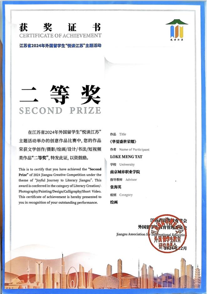近日,由省教育厅主办的江苏省2024年外国留学生“悦读江苏”主题活动圆满落幕。我校留学生LOKE MENG TAT表现优异,荣获绘画作品二等奖荣誉。