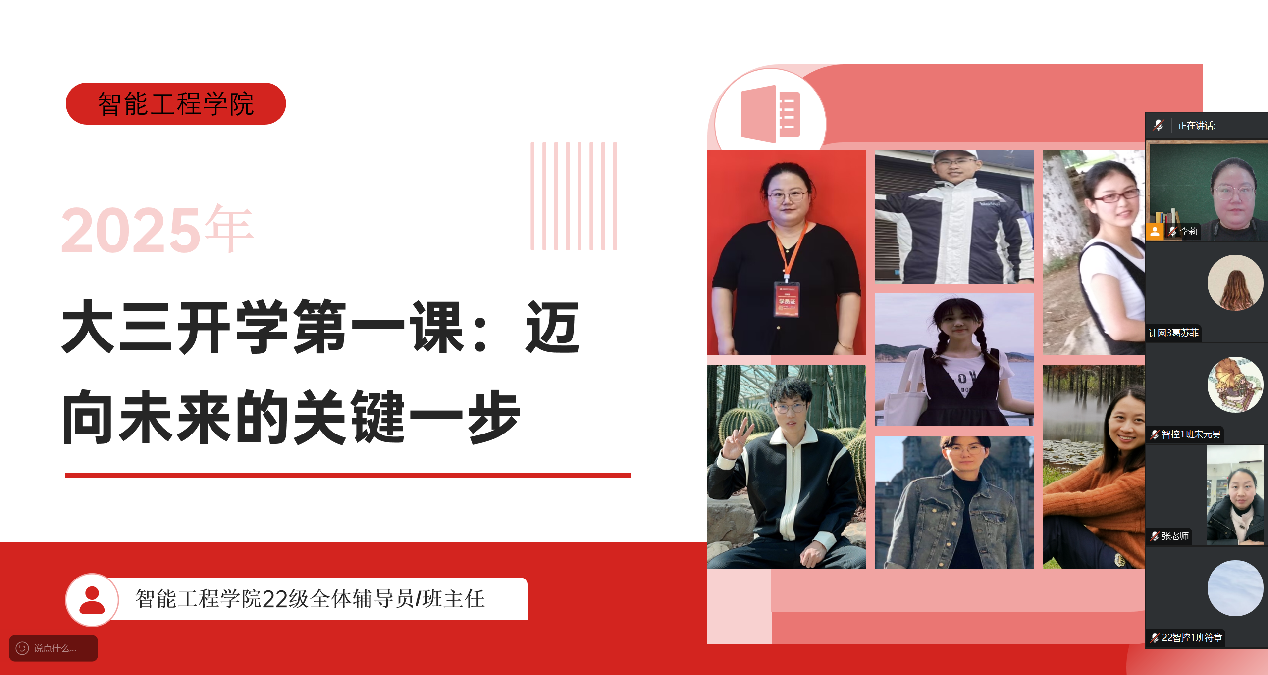 2025年2月20日中午,智能工程学院大三全体辅导员、班主任精心组织了一场线上开学第一课主题班会。此次班会聚焦实习安全、就业动员、身心健康、毕业论文答辩准备以及挂科重修等,全方位助力学生顺利度过实习阶段,为职业生涯做好充分准备。