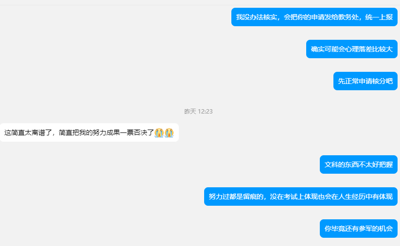 在谈话过程中,一方面,辅导员耐心倾听学生的困惑与焦虑,运用心理疏导技巧帮助学生缓解压力,引导其理性看待考试结果。另一方面,辅导员鼓励学生积极就业,为有就业意向的学生提供个性化职业规划服务,积极发布招聘信息、帮助学生修改简历、提供面试指导等帮助学生提升就业竞争力。