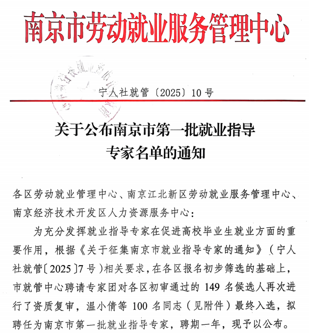 近日,南京市劳动就业服务管理中心公布《南京市第一批就业指导专家名单》(宁人社就管〔2025〕10号),我校李莉、邓莹、周宇寰三位教师成功入选。
