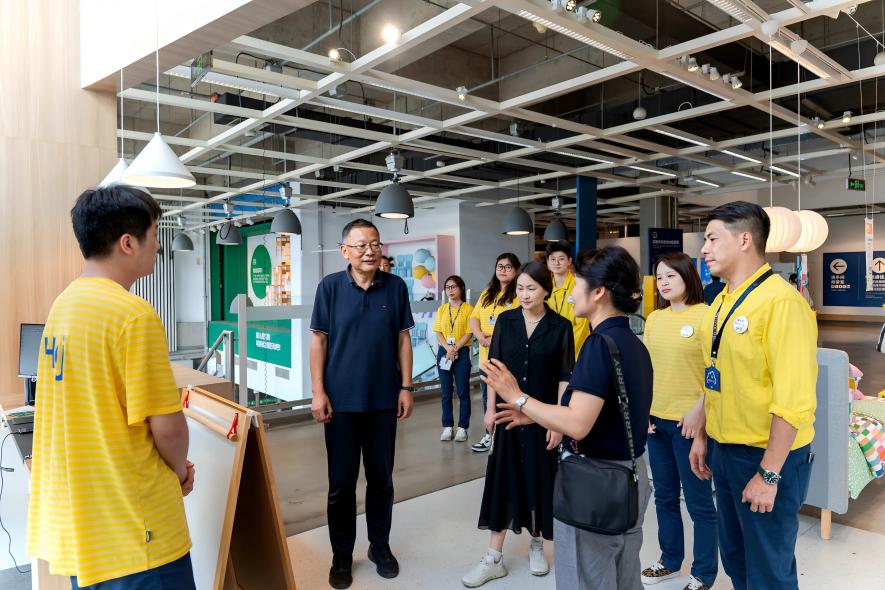 在霍光耀陪同下,孙朝晖一行走进数字文创学院与南京宜家共创课程的现场教学课堂。在这里,大家沉浸式感受企业在产品设计、视觉指引、家居装饰及视觉陈列等方面的前沿理念。从创意十足的产品构思到精妙绝伦的视觉呈现,南京宜家在职业教育领域积极探索的创新实践,赢得了大家高度赞誉。