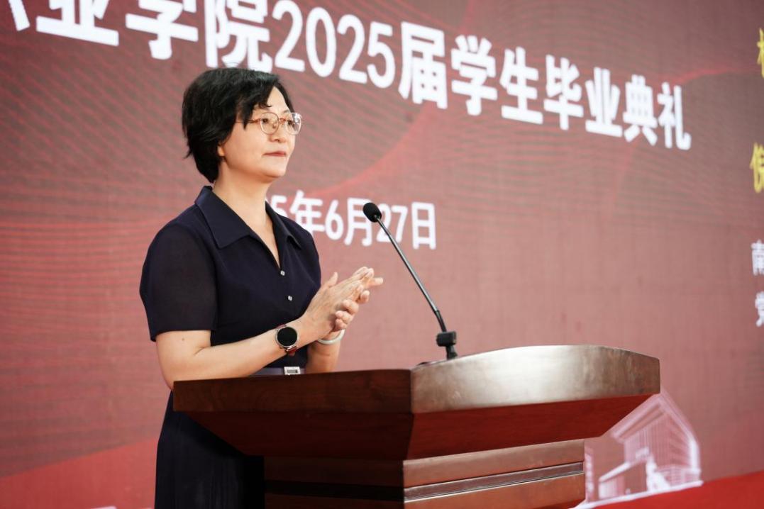 本年度毕业典礼首设校友发言环节。南京正赞软件科技有限公司总经理、2011届优秀校友李秀荣以《饮水思源念母校,薪火相传启新程》为题,寄语学弟学妹“保持终身学习、重视团队协作”,并代表全体校友祝愿母校“桃李满园,育才万千”。
