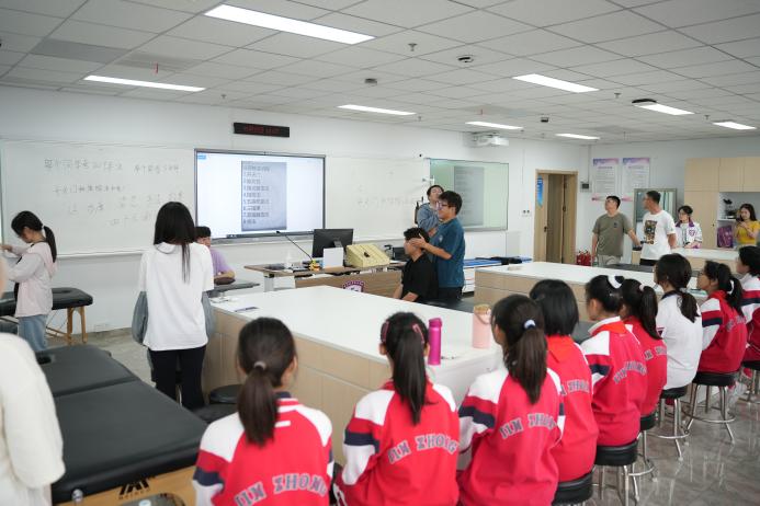 中学师生们则沿着另一条路线进行学习体验。他们的第一站是非遗活态化工艺美学体验,在科创楼的展厅里,参观精美的设计作品。随后来到直播电商中心,进一步了解直播电商行业的运营细节,感受新兴行业的蓬勃发展。在网络安全青少年体验中心,同学们通过模拟网络攻击与防御场景,深刻认识到网络安全的重要性,学习了如何识别网络诈骗、保护个人隐私等知识,增强了网络安全意识和自我保护能力。最后一站是智慧养老与康复治疗职业体验,同学们通过模拟护理场景、中医推拿与展示、骨骼健康监测,了解养老与康复治疗行业的职业要求和技能,在与模拟老人的互动中,学会了尊老助老,培养了关爱他人、服务社会的责任感。