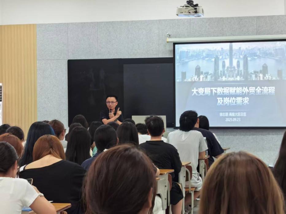 接着,行业专家徐志朋总监从大变局下数据赋能外贸行业发展的角度出发,为新生们深入剖析了数据赋能市场分析、精准获客、风险管控等实际应用场景,以及商务数据分析的应用前景和发展趋势。徐总表示,随着数字化转型的加速推进,目前,数据分析已经成为企业提升竞争力、实现创新发展的关键要素。无论是电商、金融、零售,还是制造业、医疗等行业,都对商务数据分析人才有着强烈的需求。